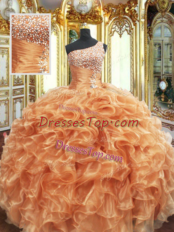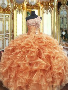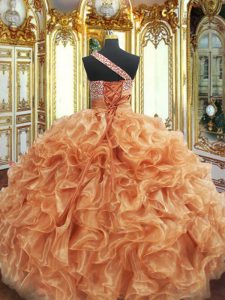 Charming Ball Gowns 15th Birthday Dress Orange One Shoulder Organza Sleeveless Floor Length Lace Up