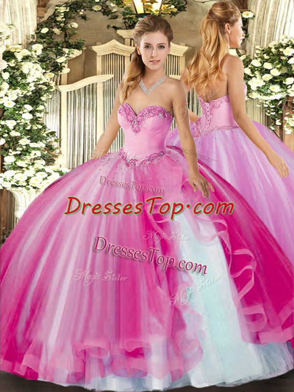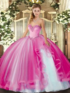 Charming Fuchsia Ball Gowns Tulle Sweetheart Sleeveless Beading and Ruffles Floor Length Lace Up Quince Ball Gowns