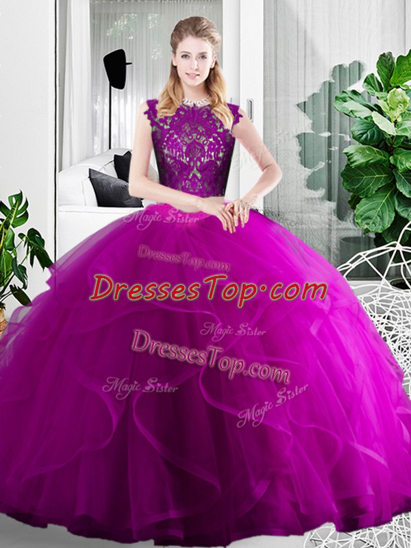 Charming Fuchsia Scoop Neckline Lace and Ruffles Sweet 16 Quinceanera Dress Sleeveless Zipper