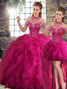Charming Fuchsia Three Pieces Halter Top Sleeveless Tulle Floor Length Lace Up Beading and Ruffles Quinceanera Dresses