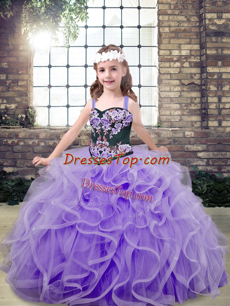Charming Lavender Child Pageant Dress Party and Wedding Party with Embroidery and Ruffles Straps Sleeveless Lace Up