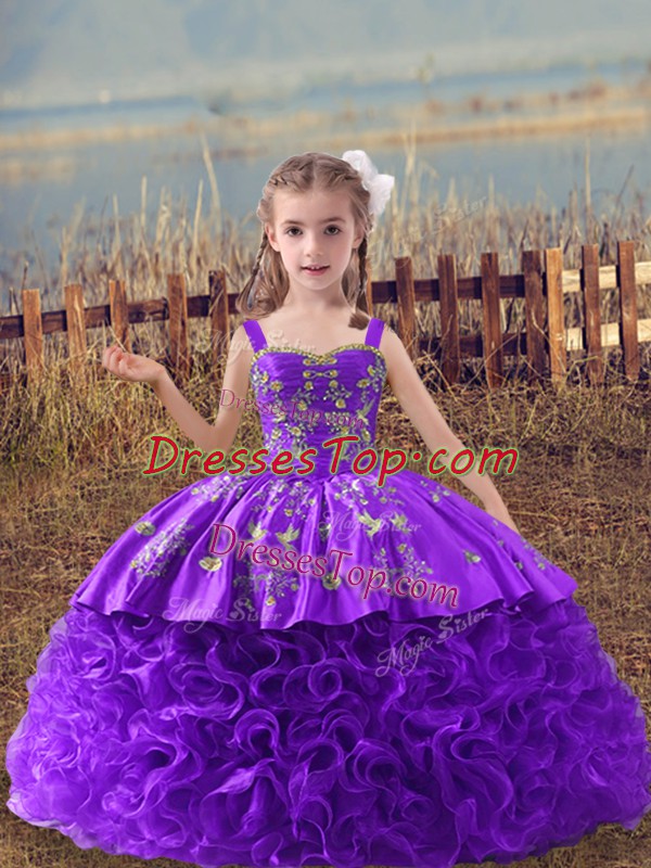 Charming Lavender Fabric With Rolling Flowers Lace Up Straps Sleeveless Pageant Gowns For Girls Sweep Train Embroidery