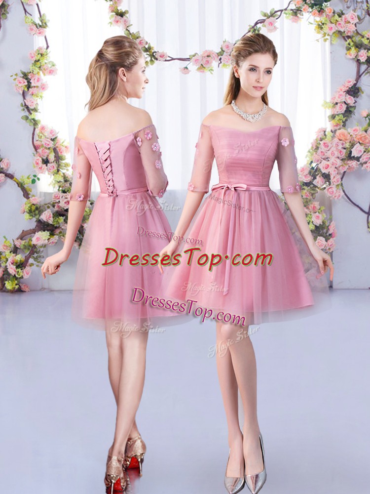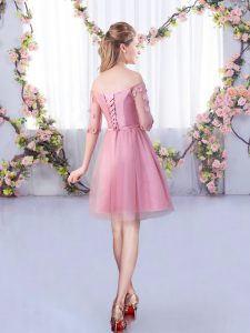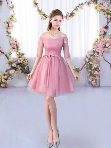 Charming Pink Tulle Lace Up Dama Dress Half Sleeves Mini Length Lace and Belt