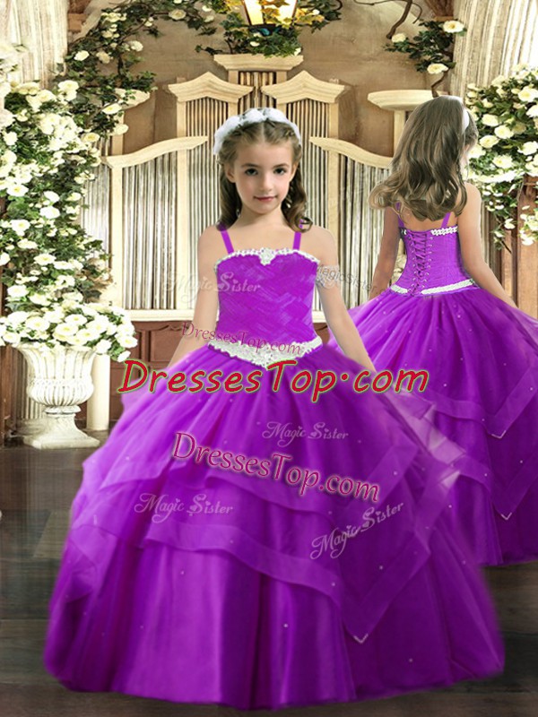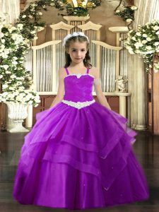 Charming Purple Lace Up Pageant Gowns For Girls Appliques and Ruffled Layers Sleeveless Floor Length