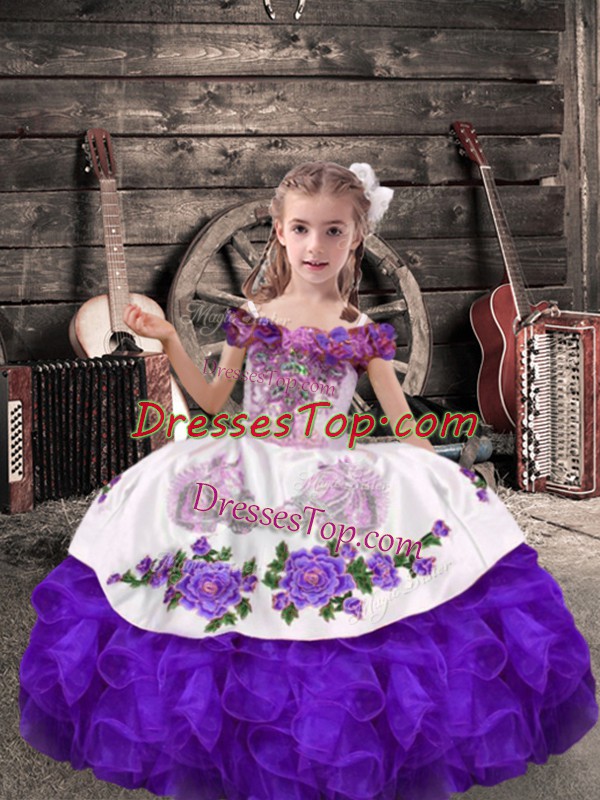 Charming Purple Organza Lace Up Off The Shoulder Sleeveless Floor Length Custom Made Pageant Dress Beading and Embroidery and Ruffles