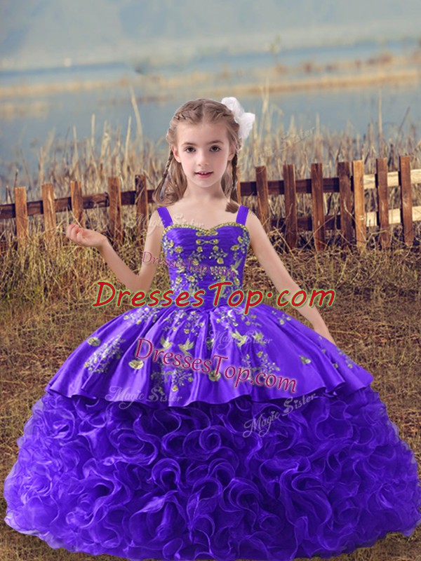 Charming Purple Straps Lace Up Embroidery Kids Formal Wear Sweep Train Sleeveless