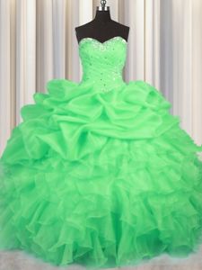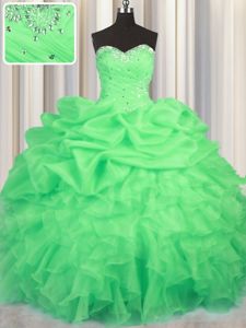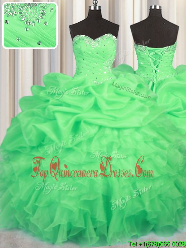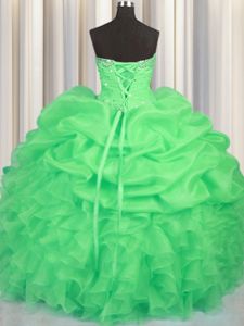 Charming Sleeveless Floor Length Beading and Ruffles and Ruching and Pick Ups Lace Up Ball Gown Prom Dress with Green
