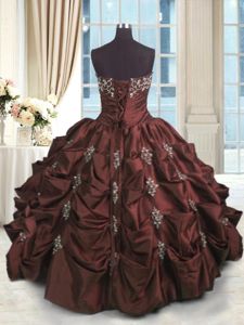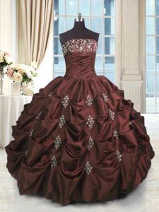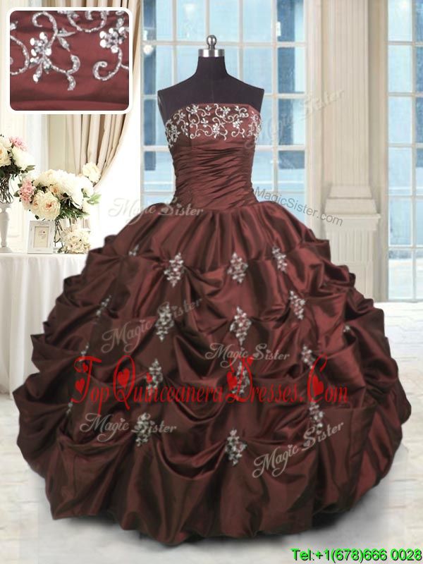 Charming Strapless Sleeveless Quinceanera Dresses Floor Length Beading and Appliques and Embroidery and Pick Ups Burgundy Taffeta