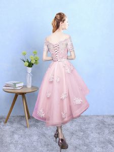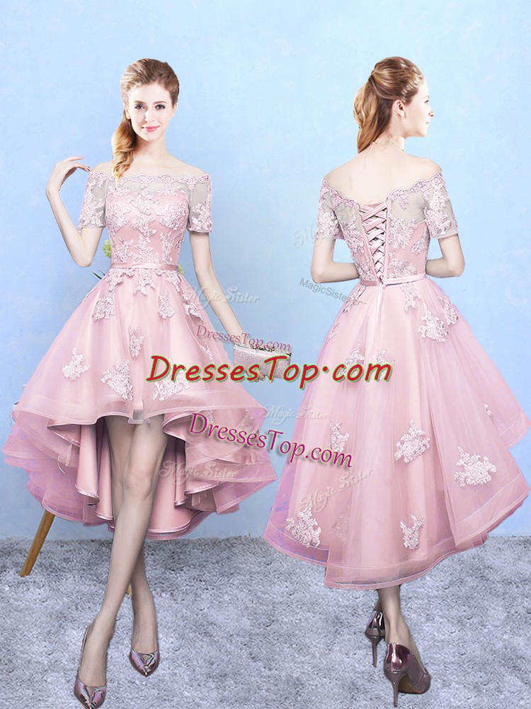Cheap Baby Pink A-line Lace Court Dresses for Sweet 16 Lace Up Tulle Short Sleeves High Low
