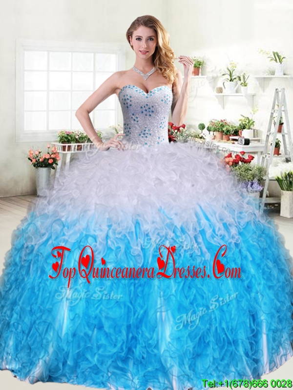 Cheap Beaded and Ruffled Quinceanera Dress in Blue and White