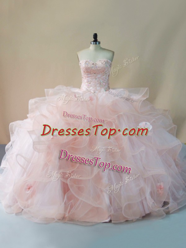 Cheap Brush Train Ball Gowns Vestidos de Quinceanera Pink Sweetheart Tulle Sleeveless Lace Up