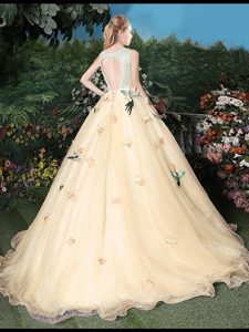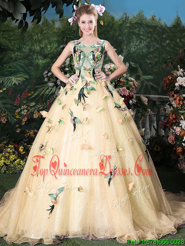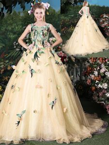 Cheap Champagne 15th Birthday Dress Scoop Sleeveless Brush Train Lace Up
