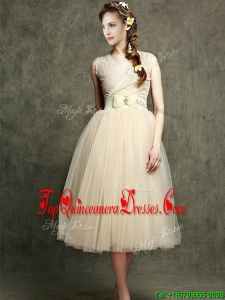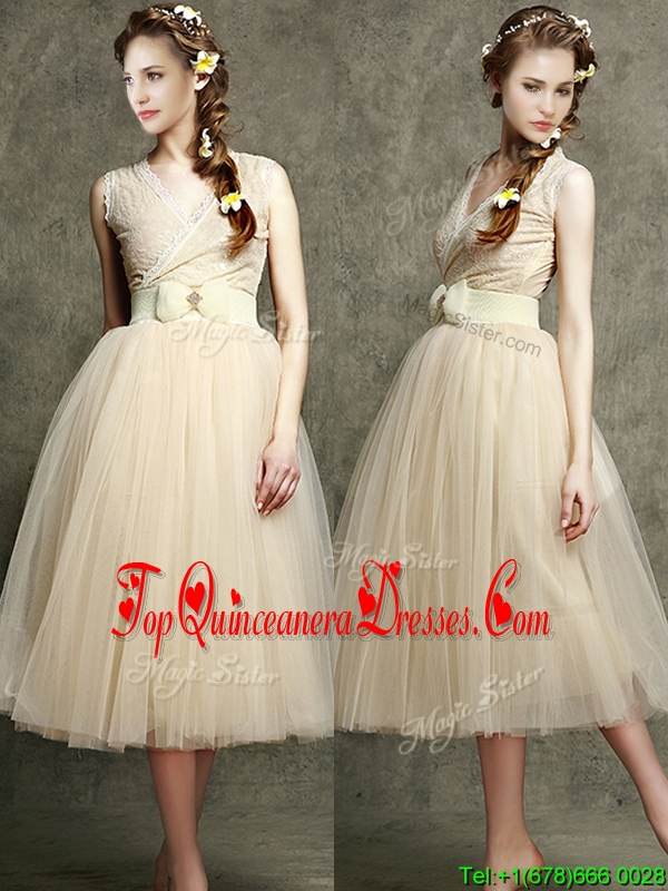 Cheap Champagne V Neck Quinceanera Dama Dress with Belt and Bowknot