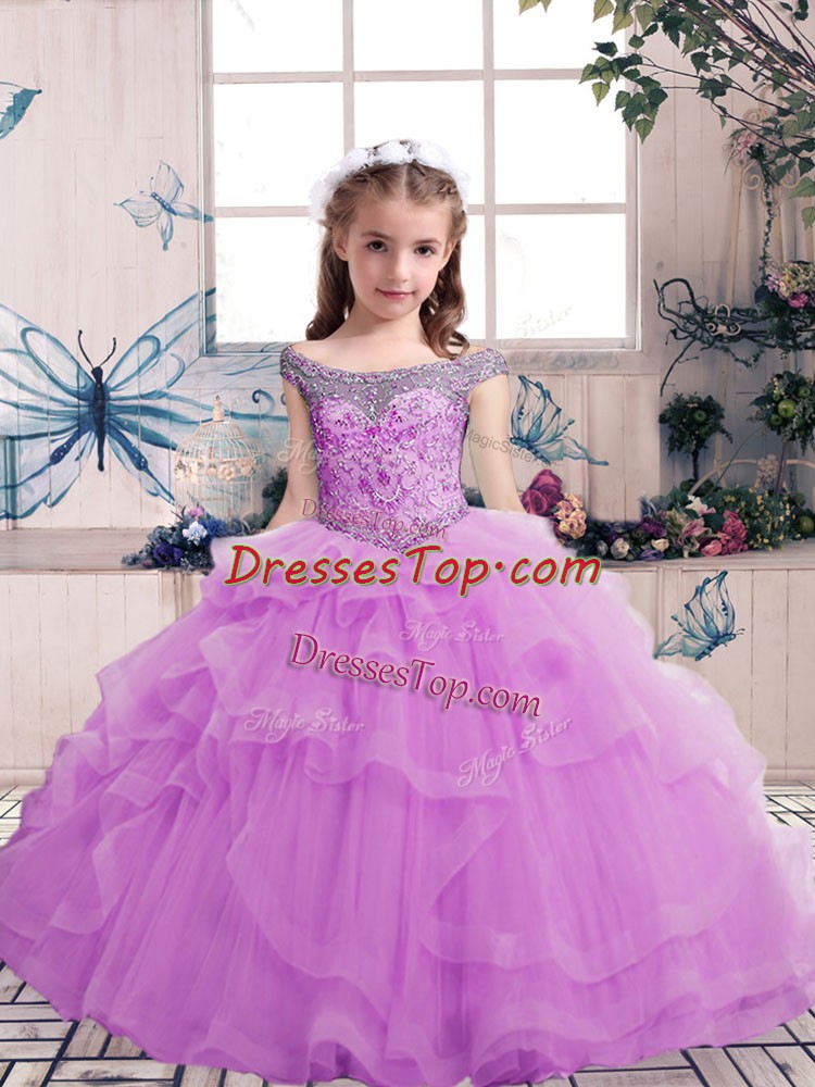 Cheap Floor Length Lace Up Little Girl Pageant Dress Lilac for Party and Military Ball and Wedding Party with Beading