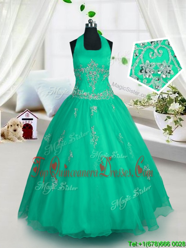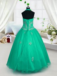 Cheap Halter Top Green Tulle Lace Up Pageant Dress Sleeveless Floor Length Appliques