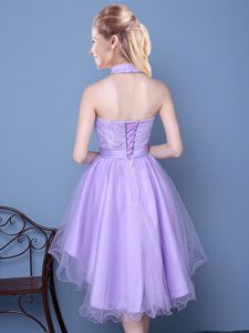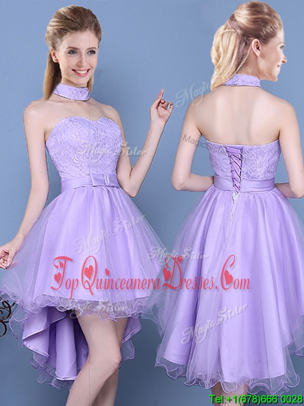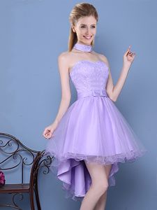Cheap Lavender Lace Up Court Dresses for Sweet 16 Lace and Bowknot Sleeveless High Low