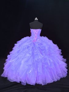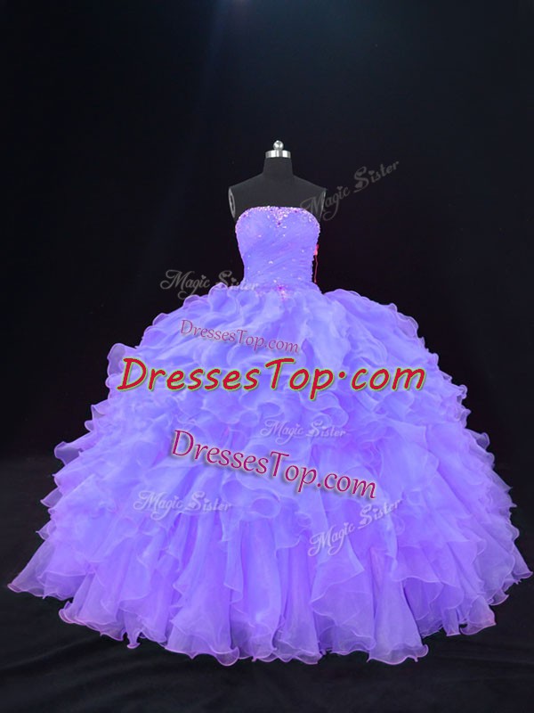 Cheap Purple Ball Gowns Organza Strapless Sleeveless Beading and Ruffles Floor Length Lace Up 15 Quinceanera Dress
