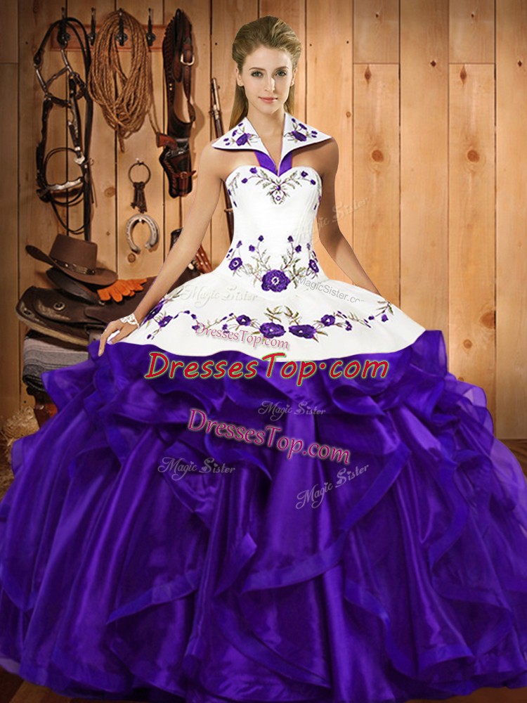 Cheap Purple Halter Top Neckline Embroidery and Ruffled Layers Ball Gown Prom Dress Sleeveless Lace Up