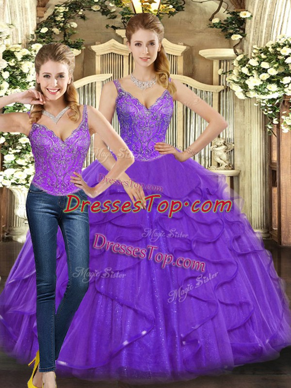 Cheap Purple Straps Neckline Beading and Ruffles Ball Gown Prom Dress Sleeveless Lace Up