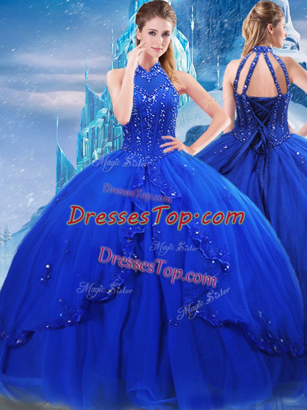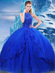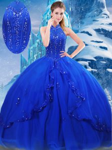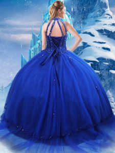 Cheap Royal Blue Lace Up 15th Birthday Dress Beading and Ruffles Sleeveless Brush Train
