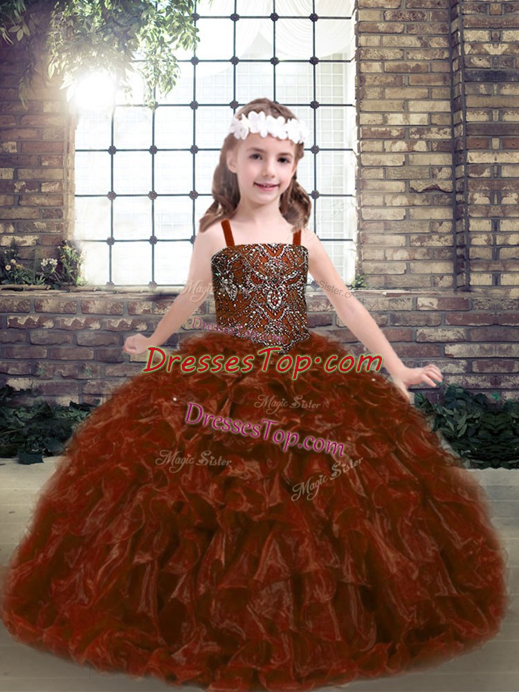 Cheap Rust Red Organza Lace Up Straps Sleeveless Floor Length Kids Formal Wear Beading