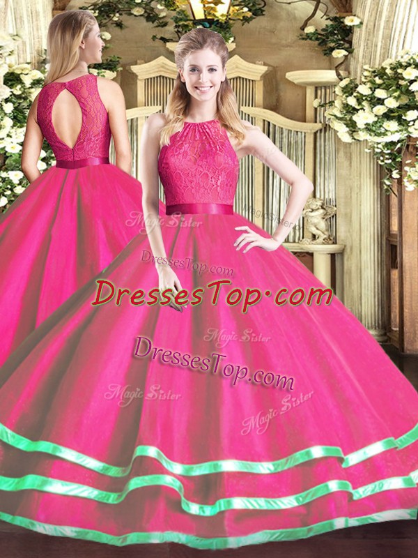 Cheap Scoop Sleeveless 15th Birthday Dress Floor Length Lace Hot Pink Tulle