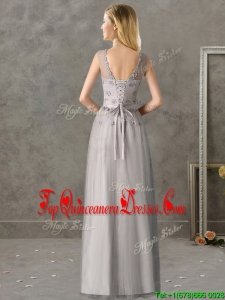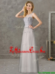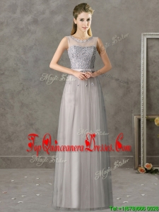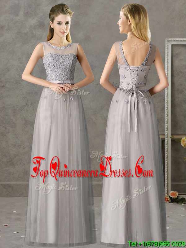 Cheap See Through Scoop Grey Long Damas Dress with Appliques