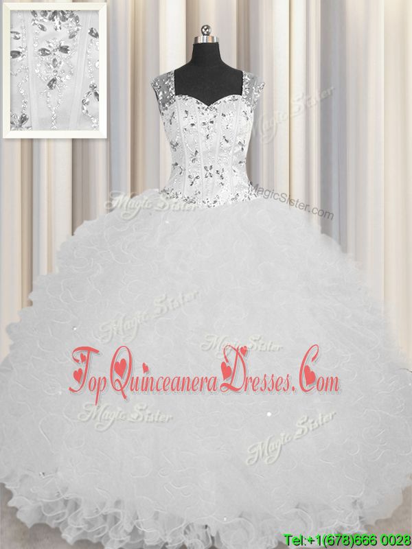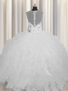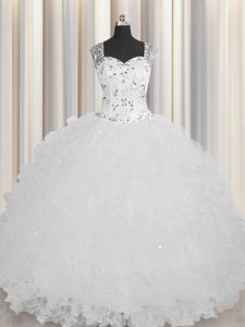 Cheap See Through Zipper Up White Ball Gowns Beading and Ruffles Quinceanera Gown Zipper Tulle Sleeveless Floor Length