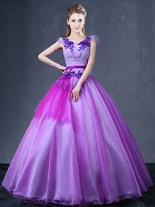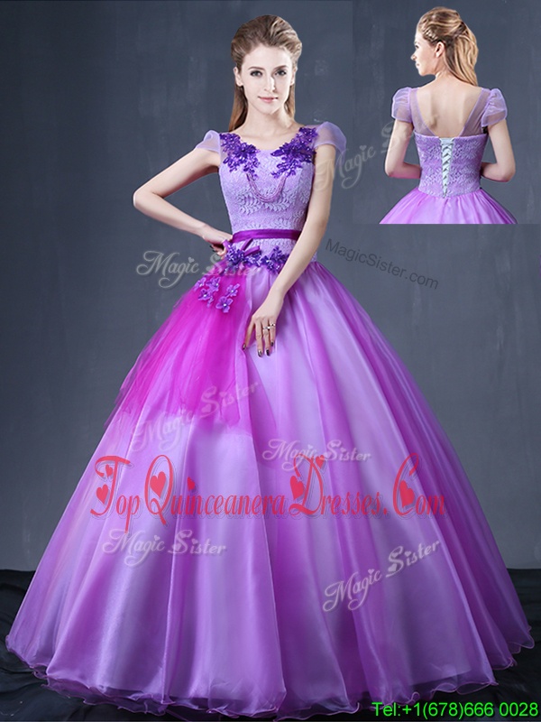 Cheap Short Sleeves Floor Length Lace Up Quinceanera Gowns Lavender and In for Military Ball and Sweet 16 and Quinceanera with Lace and Appliques