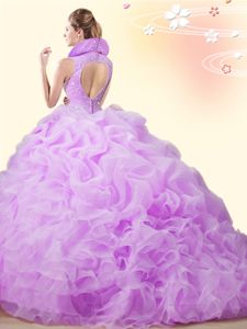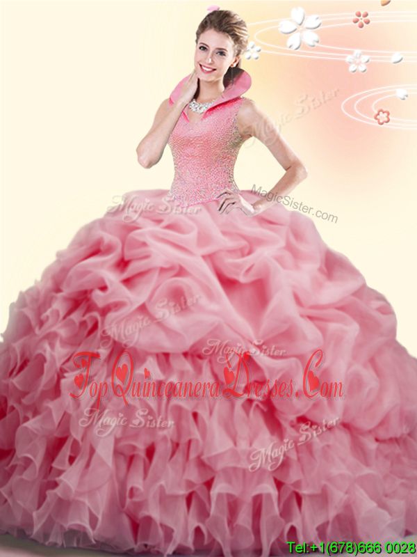 Cheap Watermelon Red Organza Backless High-neck Sleeveless 15th Birthday Dress Brush Train Beading and Ruffles and Pick Ups