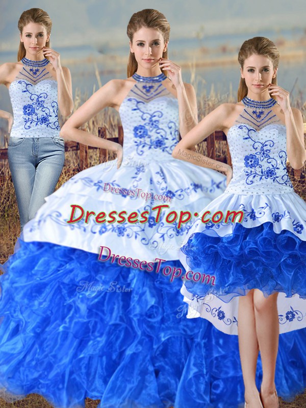Chic Blue And White Lace Up Quince Ball Gowns Embroidery and Ruffles Sleeveless Floor Length Court Train