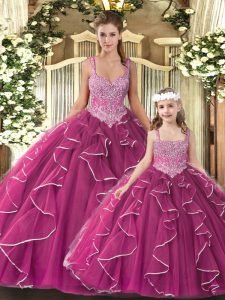 Chic Fuchsia Straps Lace Up Beading and Ruffles Sweet 16 Quinceanera Dress Sleeveless