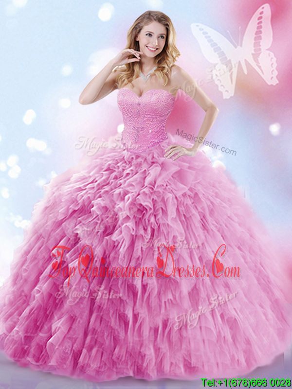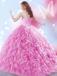 Chic Lace Up Quinceanera Dresses Rose Pink and In for Military Ball and Sweet 16 and Quinceanera with Beading and Ruffles Brush Train