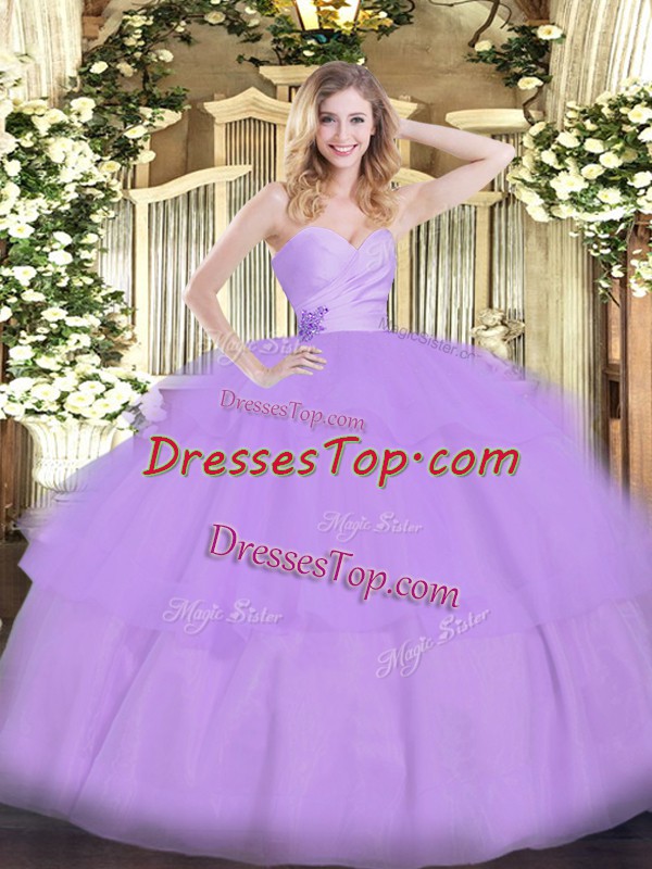 Chic Lavender Ball Gowns Organza Sweetheart Sleeveless Beading and Ruffled Layers Floor Length Lace Up 15th Birthday Dress