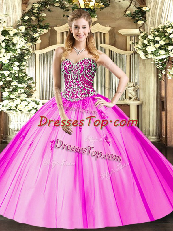 Chic Lilac Ball Gowns Sweetheart Sleeveless Tulle Floor Length Lace Up Beading and Appliques Quinceanera Dresses