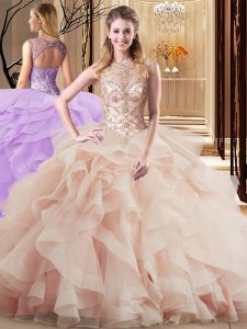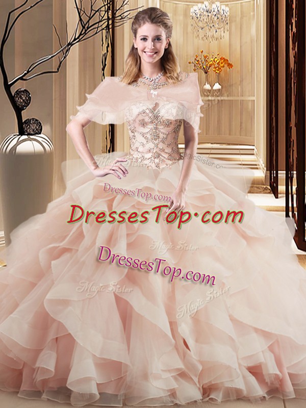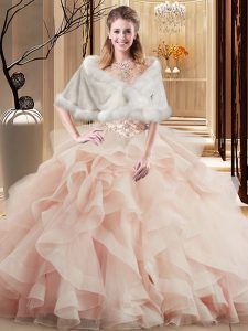 Chic Peach Scoop Lace Up Beading and Ruffles Quinceanera Gown Brush Train Sleeveless