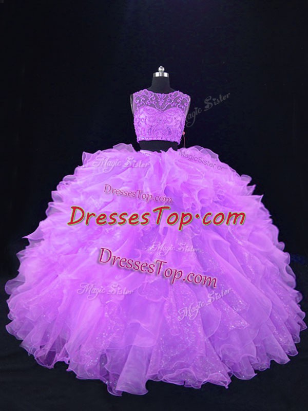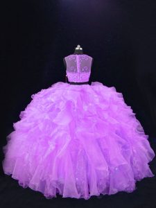 Chic Sleeveless Organza Floor Length Zipper Quinceanera Gowns in Lavender with Beading and Ruffles
