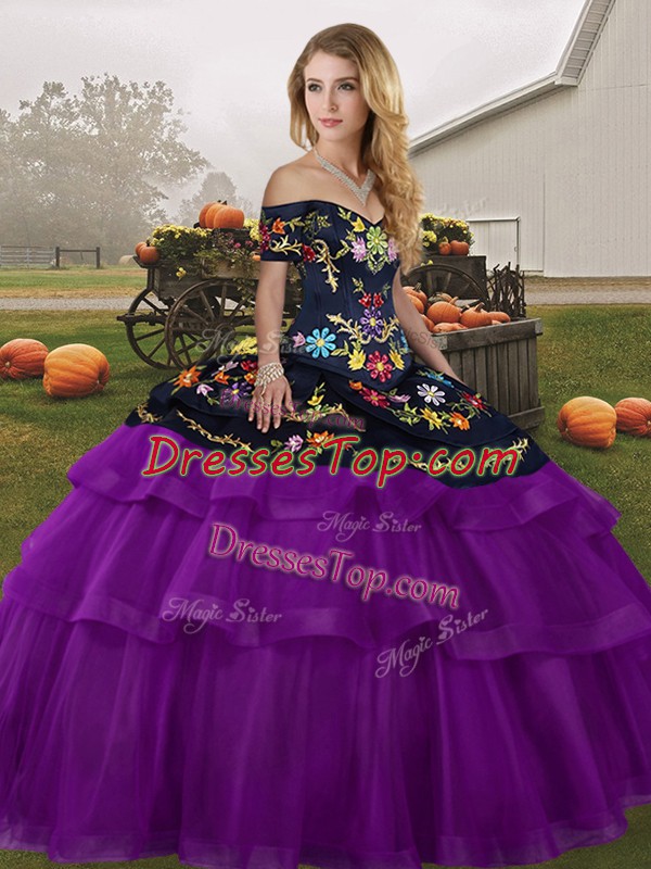 Chic Tulle Off The Shoulder Sleeveless Brush Train Lace Up Embroidery and Ruffled Layers Quinceanera Gown in Black And Purple