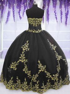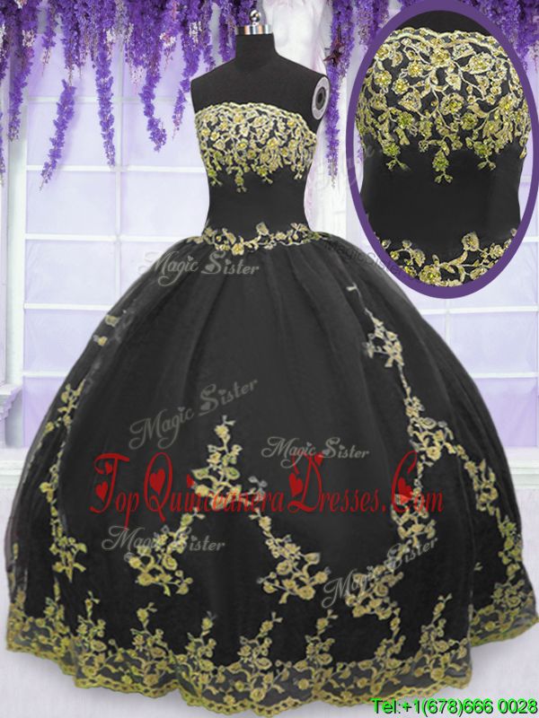 Chic Tulle Strapless Sleeveless Zipper Appliques Sweet 16 Dress in Black