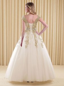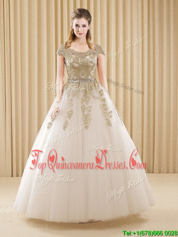 Chic White Scoop Neckline Beading and Appliques Quinceanera Gown Short Sleeves Lace Up