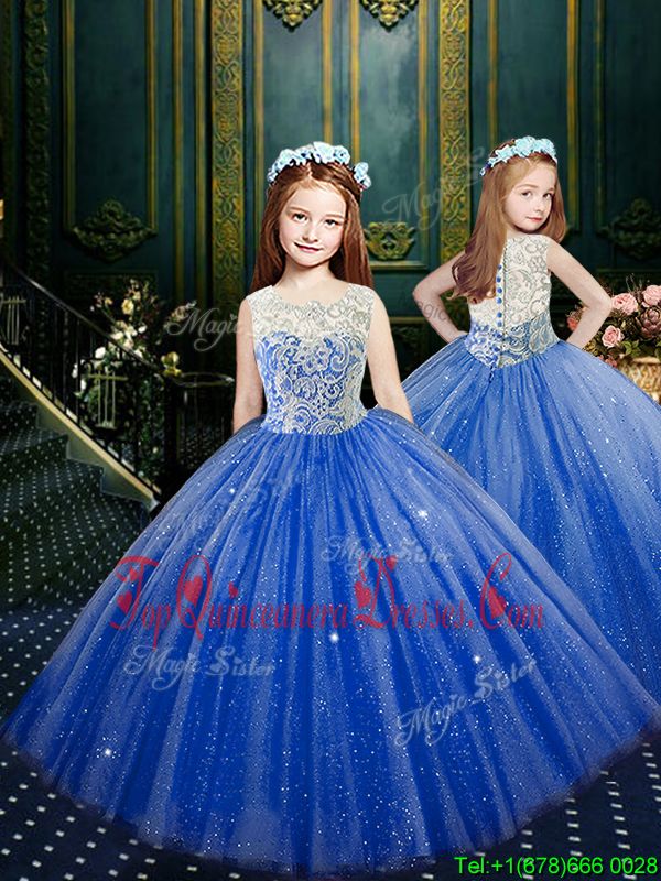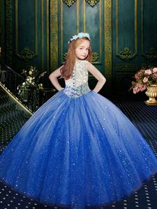 Clasp Handle Scoop Sleeveless Little Girl Pageant Gowns Floor Length Appliques Blue Tulle