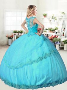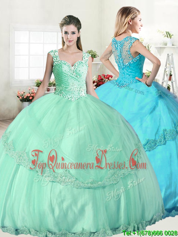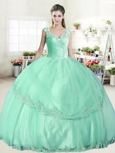 Classical Apple Green Tulle Lace Up Straps Sleeveless Floor Length Vestidos de Quinceanera Beading and Lace and Appliques