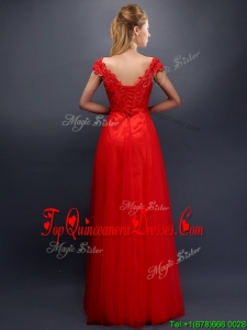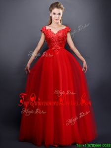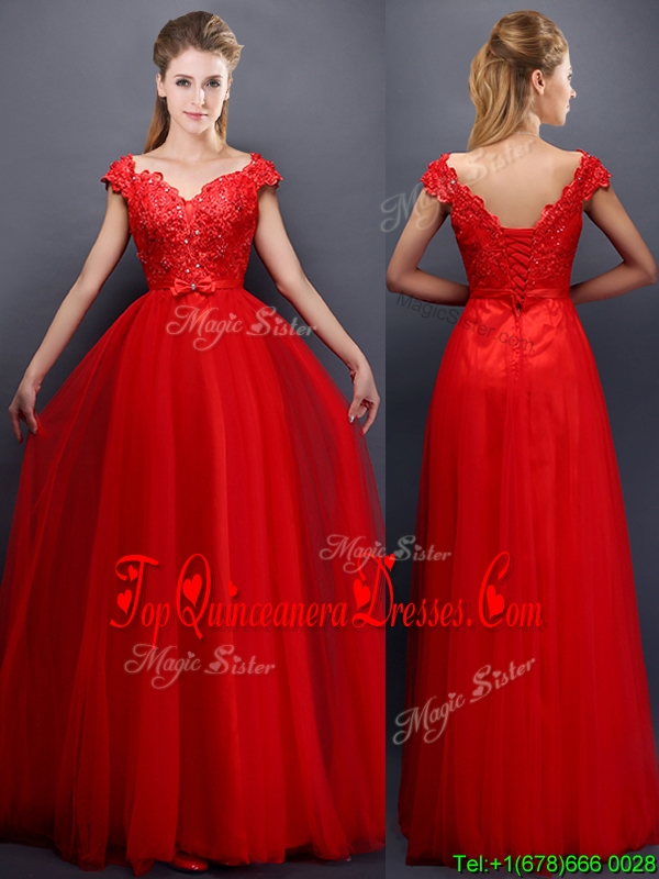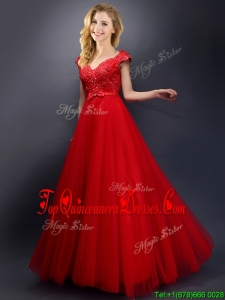 Classical Beaded V Neck Red Quinceanera Dama Dress with Cap Sleeves