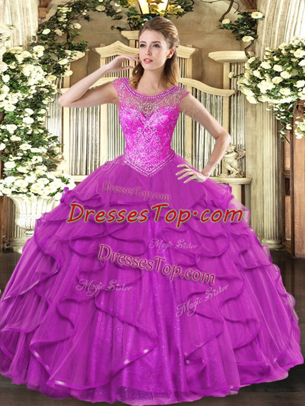 Classical Fuchsia Ball Gowns Beading and Ruffles Quinceanera Dresses Lace Up Tulle Sleeveless Floor Length