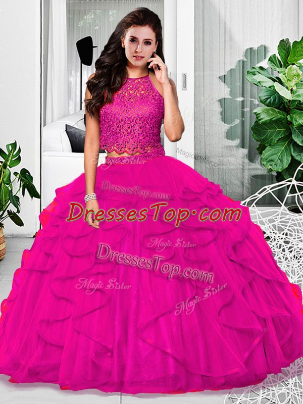 Classical Lace and Ruffles Quinceanera Gown Fuchsia Zipper Sleeveless Floor Length