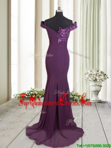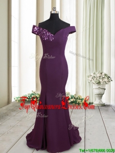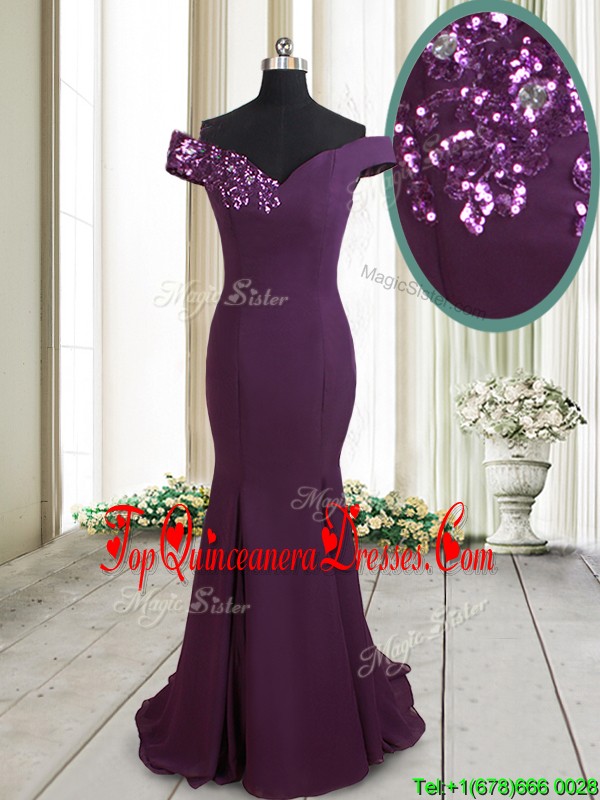 Classical Mermaid Off the Shoulder Brush Train Sequined Dama Dress in Dark Purple