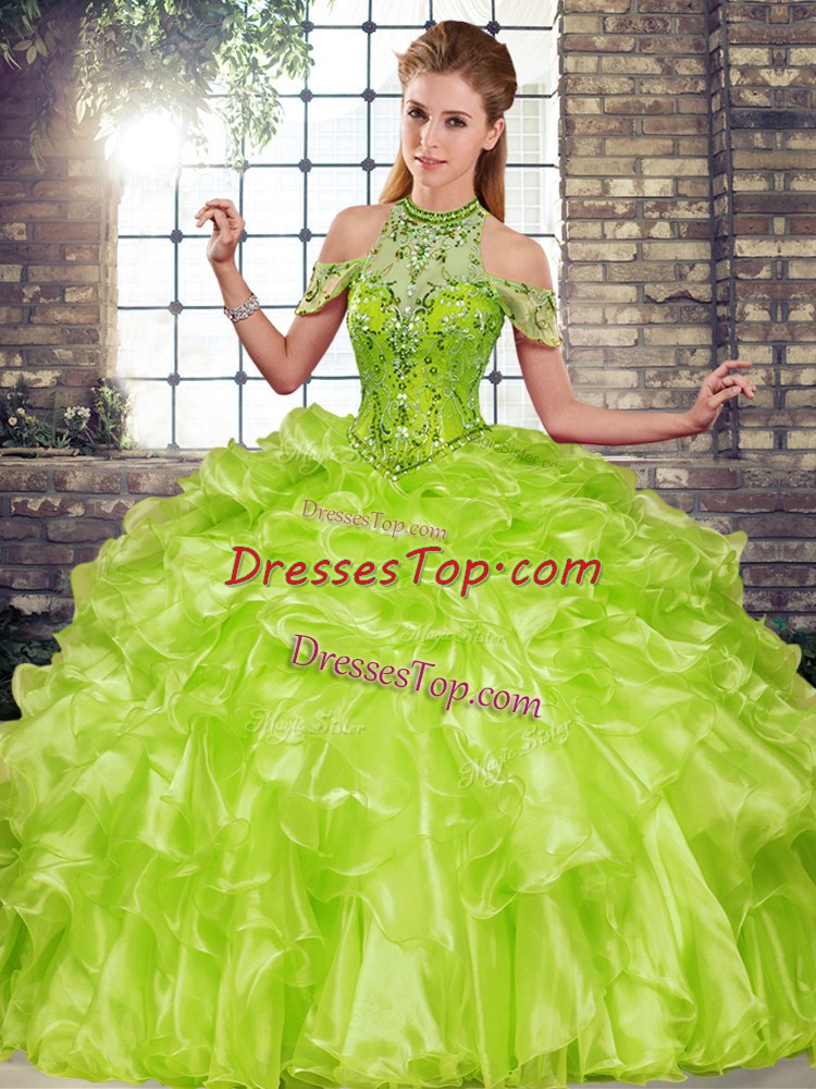 Classical Olive Green Ball Gowns Beading and Ruffles Quinceanera Gowns Lace Up Organza Sleeveless Floor Length