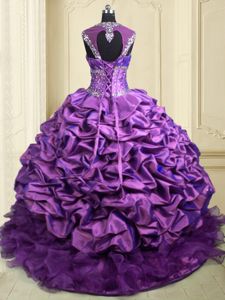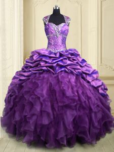 Classical Purple Organza and Taffeta Lace Up Quince Ball Gowns Cap Sleeves With Brush Train Beading and Ruffles and Pick Ups