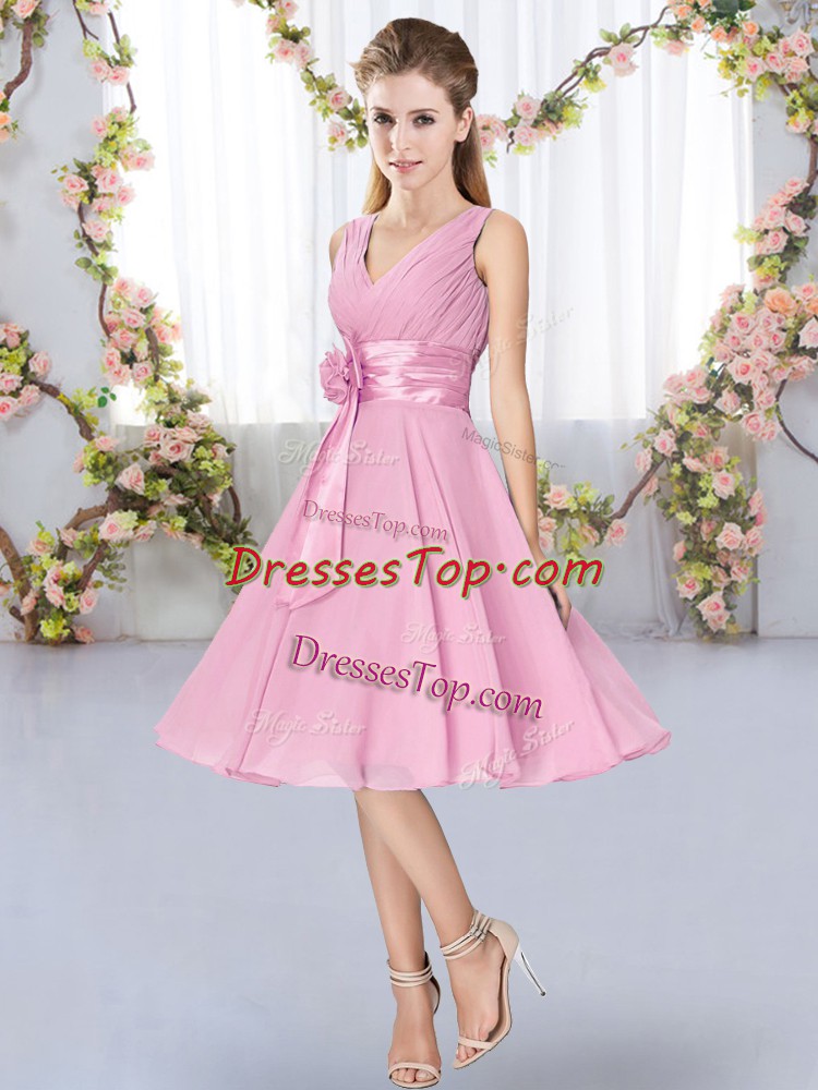 Classical Sleeveless Knee Length Hand Made Flower Lace Up Quinceanera Court of Honor Dress with Rose Pink
