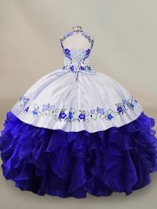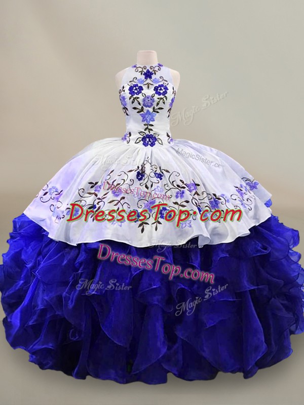 Classical Sleeveless Organza Floor Length Lace Up Ball Gown Prom Dress in Blue And White with Embroidery and Ruffles